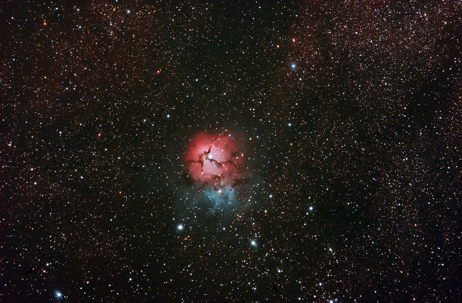 La Nebulosa Trífida es una gigantesca nube de gas y polvo en la que se están formando estrellas, localizada a unos 5.400 años luz de distancia en la constelación de Sagitario. Contiene cuatro nódulos fríos, o núcleos, de polvo. Estos núcleos son “incubadoras” donde nacen las estrellas. Presenta una cualidad única, y es que está dominada por una estrella central masiva, de unos 300.000 años de edad. La radiación y los vientos que emanan de la estrella han esculpido la nube.