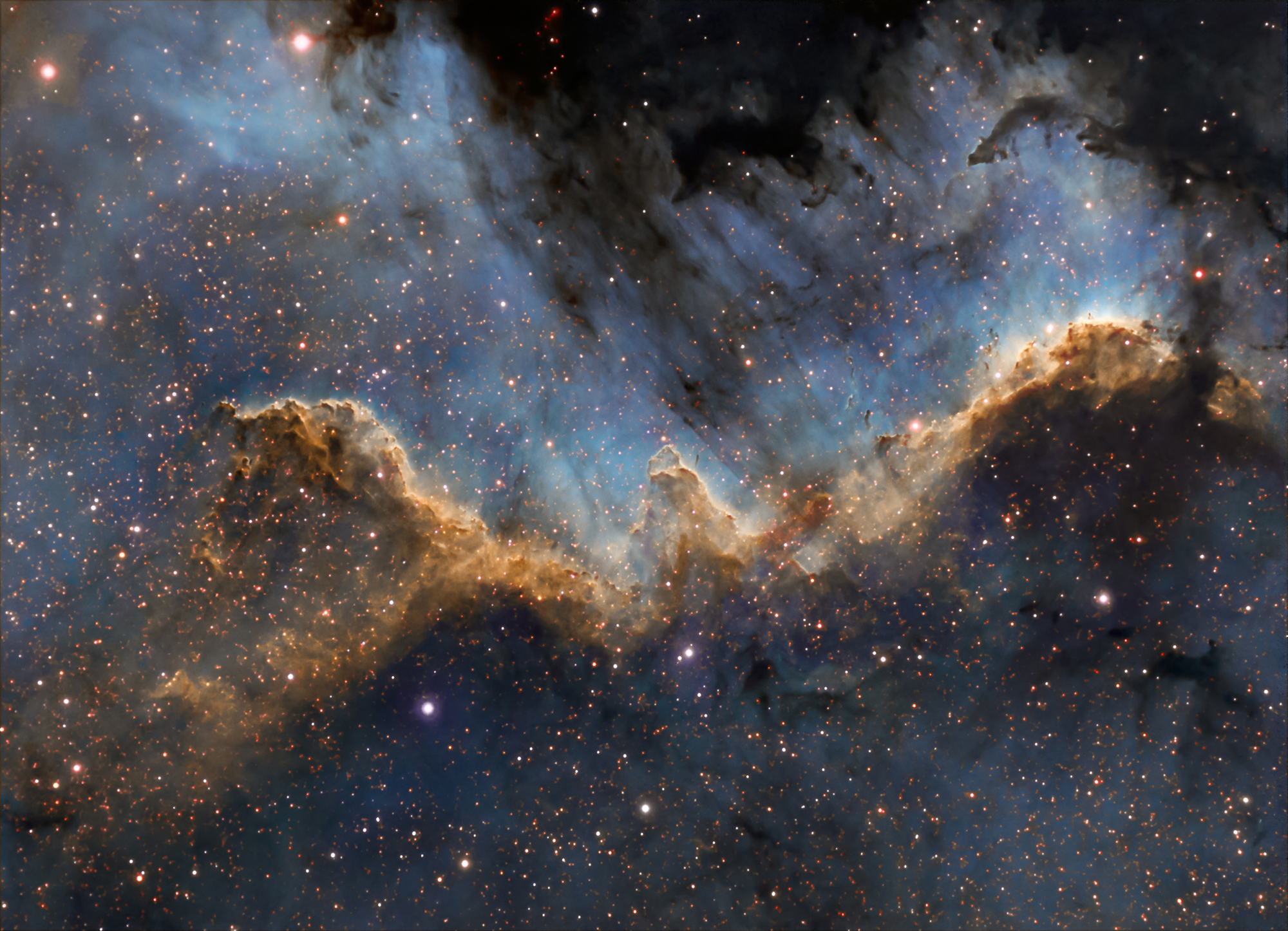 En la constelación Cygnus se encuentra el complejo de nebulosas Norteamérica - Pelícano (NGC 7000 / IC 5070) y las nebulosas de emisión que rodean Gamma Cygni. Se trata de nubes moleculares frias que absorben luz de las estrellas circundantes. Están constituídas principalmente por H2 neutro, y en su interior tiene lugar una intensa formación de estrellas. Pero la radiación de alta energía de las estrellas jóvenes de gran masa disocia e ioniza el hidrógeno que, al recombinarse, emite la característica luz roja. Su distancia estimada es de unos 1.800 años luz de la Tierra. .